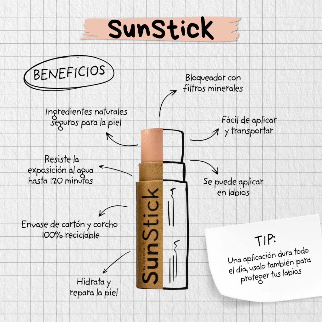 SunStick actúa como barrera natural contra los rayos UVA y UVB gracias a sus filtros minerales: óxido de zinc y dióxido de titanio. Su fórmula 100% natural es segura para tu piel y el medio ambiente.